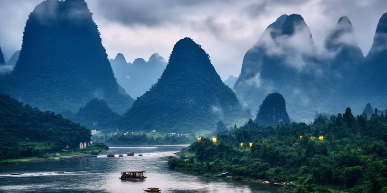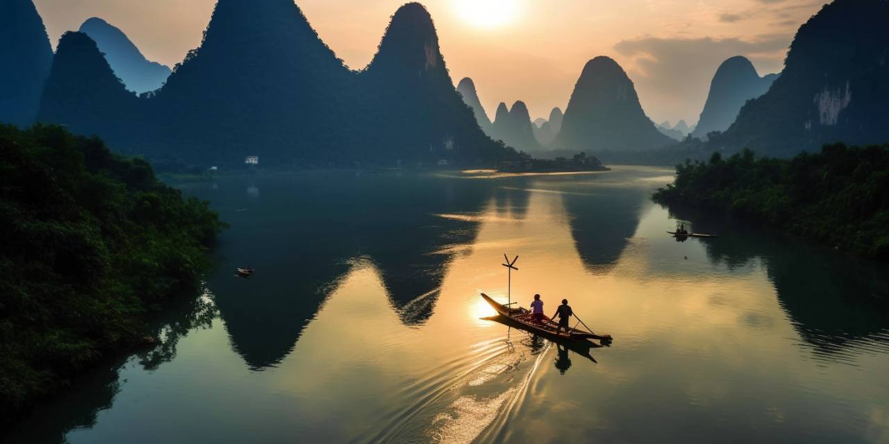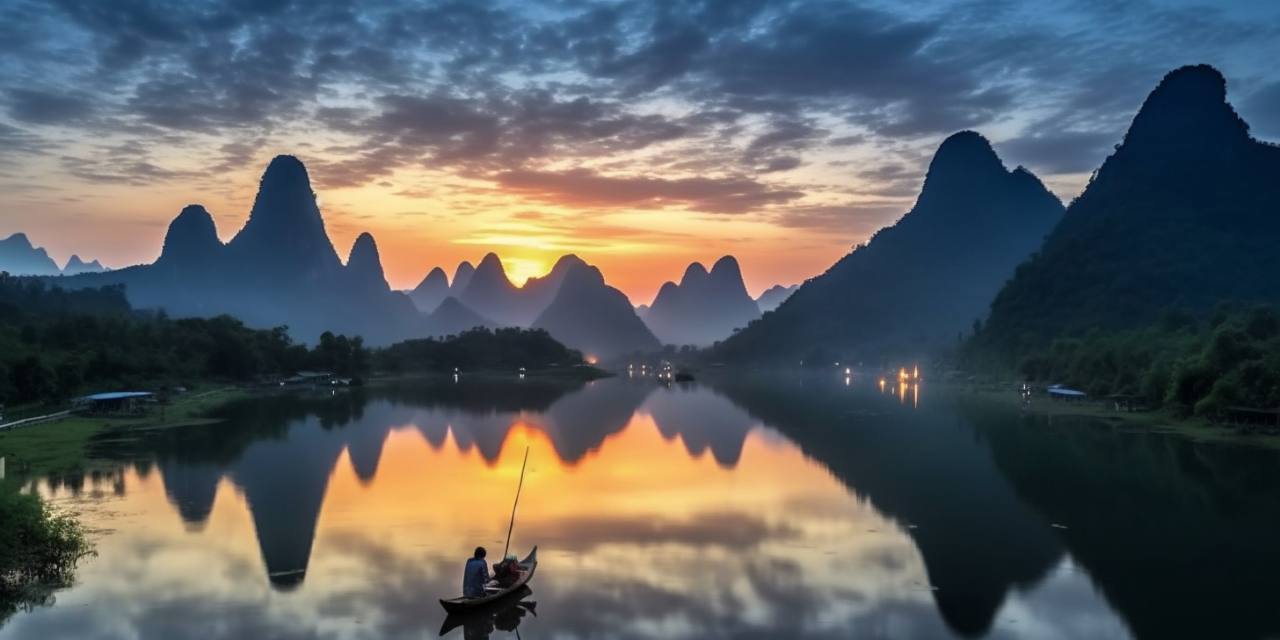 漓江山水:山水+渔火+渔翁